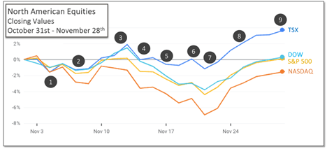 The final—and Thanksgiving-shortened—week of the month salvaged what had otherwise been a disappointing stretch for North American equity markets. The S&P 500 and Dow posted small but positive gains after rising more than 3% during the last week of November. The TSX climbed 4% in the same period and reached another all-time high.